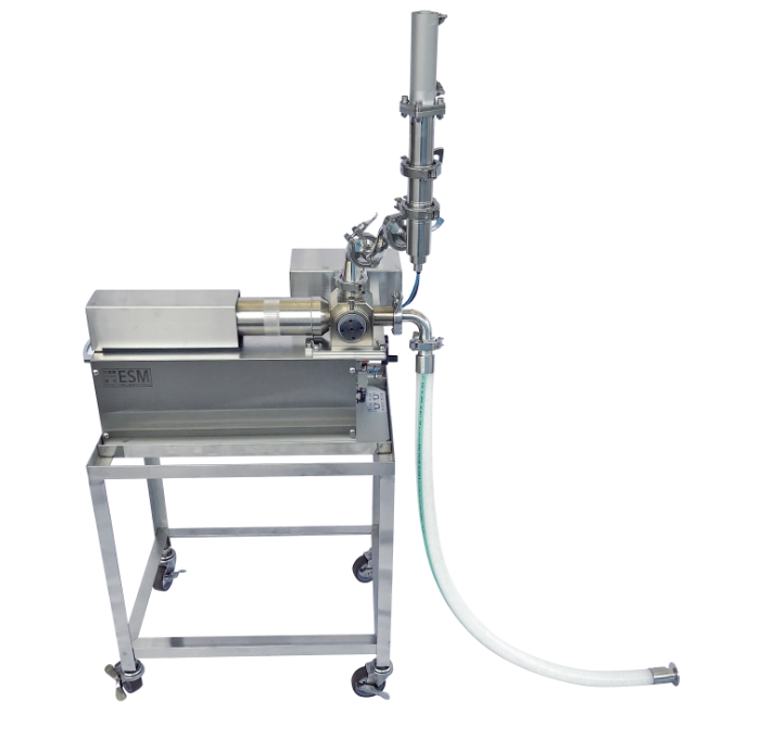 ロー台⾞の仕様。ESMを低い台に載せて充填⼝を配管で上までもっていく仕様